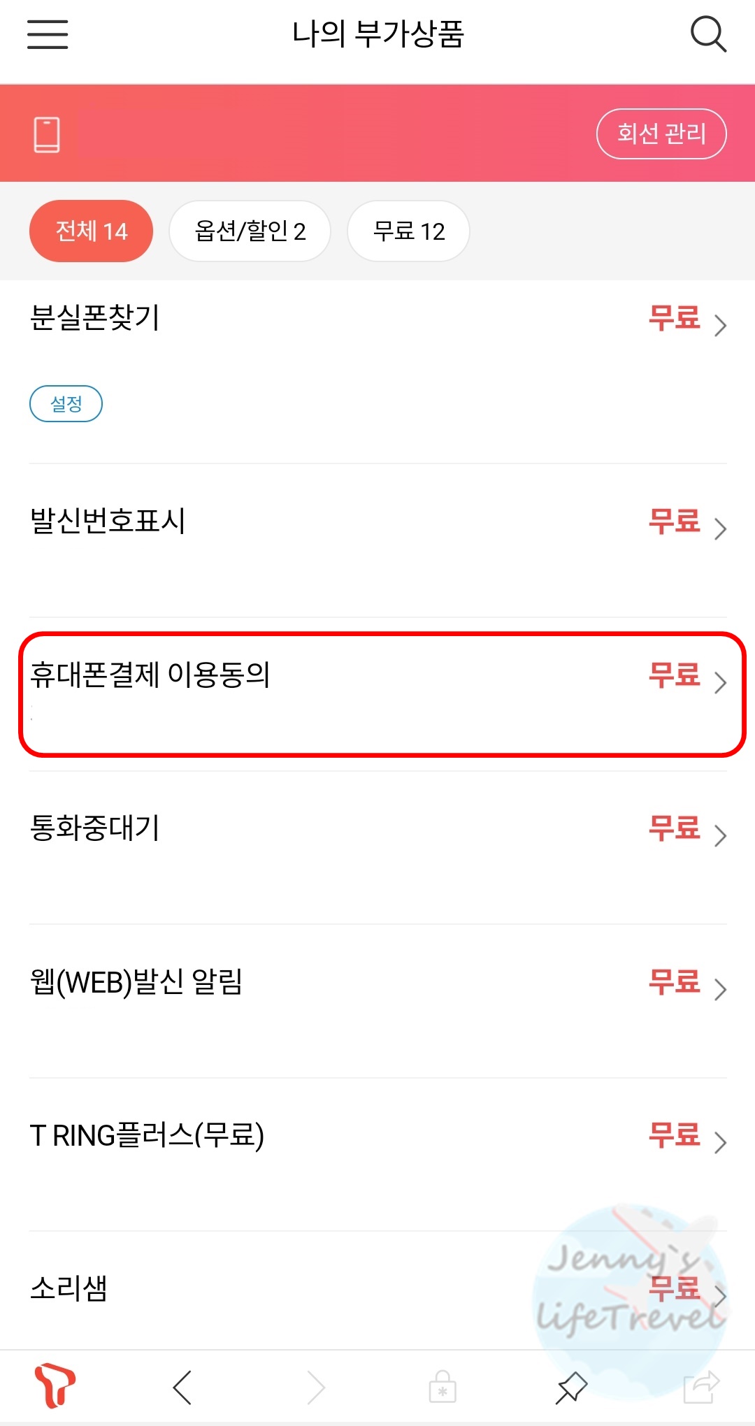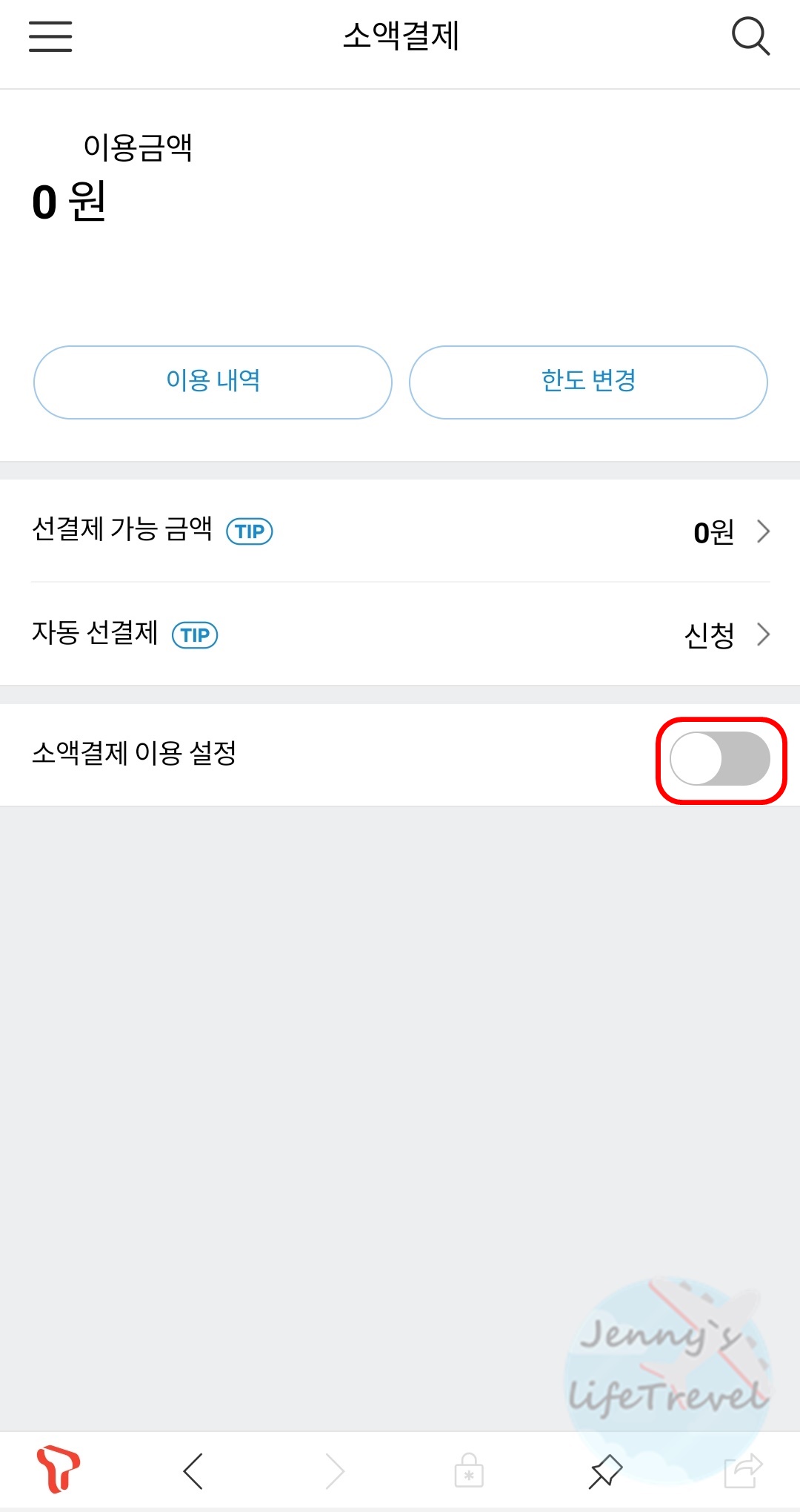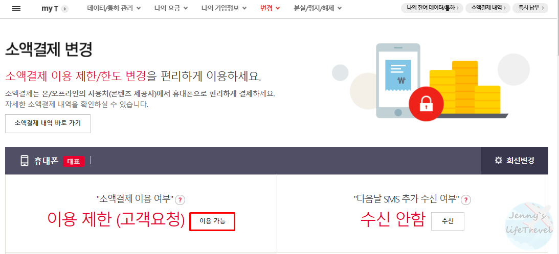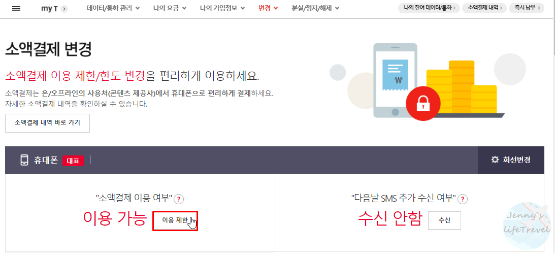 9. 소액결제 이용 설정을 활성화, 비활성화합니다.