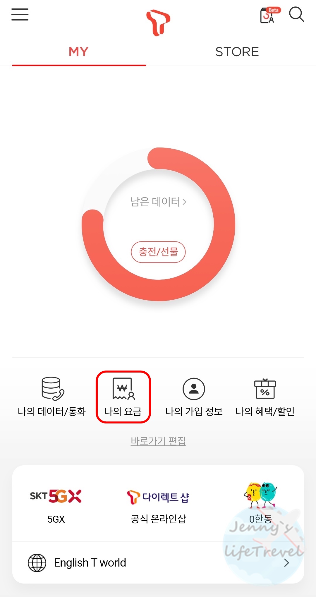 7. Tworld 앱 홈화면에서 나의 요금을 클릭합니다.