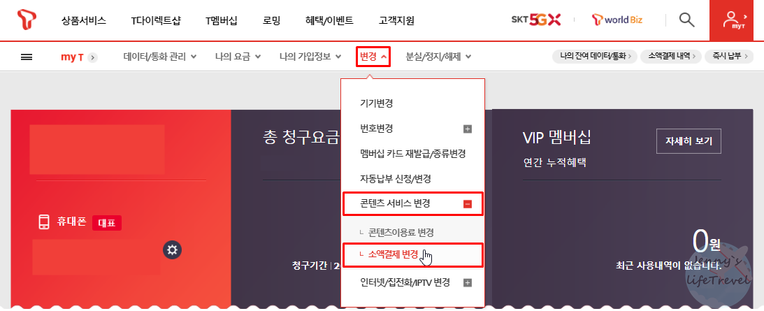 3. 변경 > 콘텐츠 서비스 변경 > 소액결제 변경을 클릭합니다.