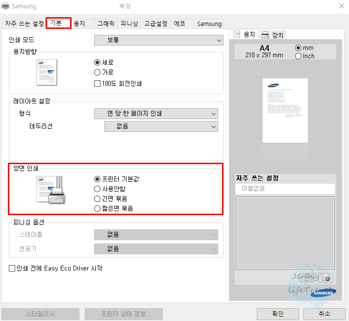 ※ 만약 양면인쇄가 보이지 않는다면 사용중인 프린터는 양면인쇄를 지원하지 않는 것입니다. 이 경우 아래의 목차 2. 수동 프린터 양면인쇄 방법을 이용하시면 됩니다.