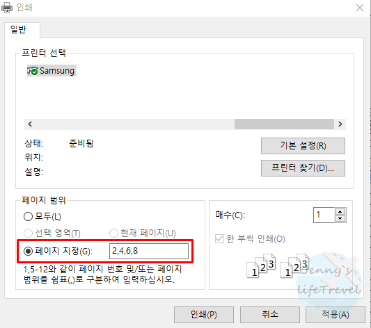 5. 프린터 인쇄 페이지 지정에서 짝수 쪽을 모두 기입한 후 인쇄합니다.