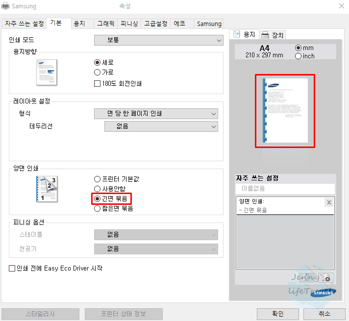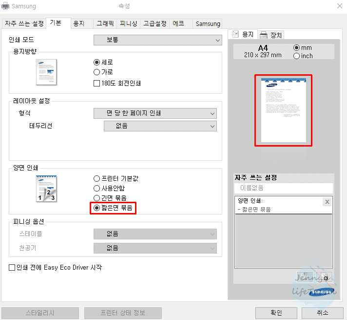3. 양면 인쇄에서 긴면 묶음 또는 짧은면 묶음을 선택한 후 출력합니다.
