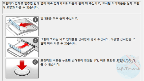 ※ 프린터 양면인쇄 수동 방법은 위와 같이 이미 출력된 홀수쪽 반대편에 짝수쪽을 출력하는 방법입니다. 따라서 출력되는 부분이 곂치지 않게 프린터의 급지함에 넣어주셔야 합니다.