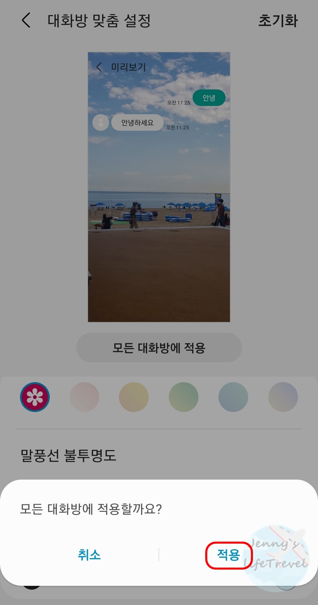 7. 모든 대화방에 적용을 누르면 모든 문자 메시지 배경화면이 동일하게 변경됩니다.