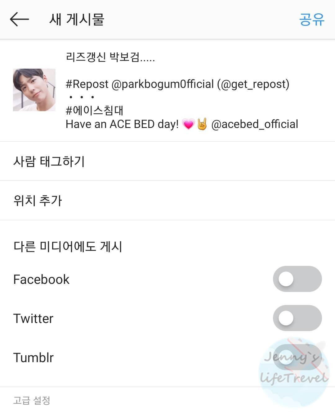 7. 공유와 함께 내가 작성하고 싶은 글을 적어주시고 아래 부분에 붙여넣기로 게시물에 있던 #과 @ 캡션을 넣어준뒤 오른쪽 상단 공유로 업로드를 하시면 됩니다. 5번에서 이미 복사가 되어 있으니 빈공간에 손가락으로 오래 탭하신 후 붙여넣기를 하시면 됩니다.