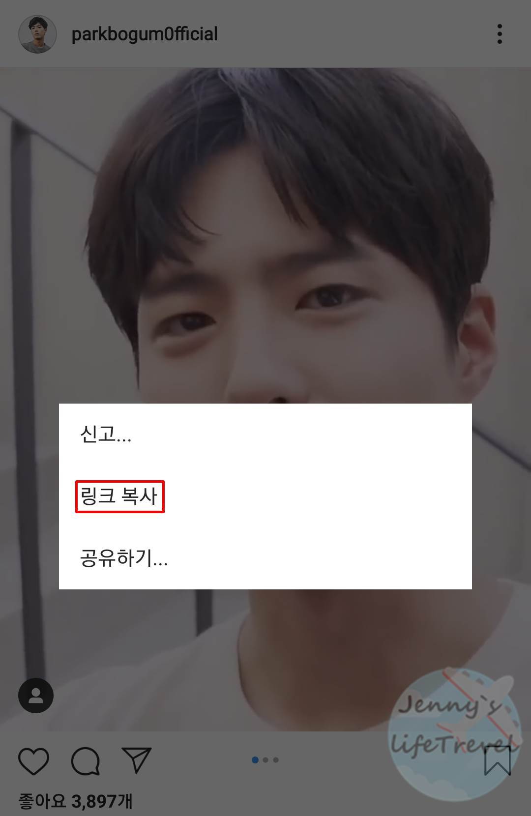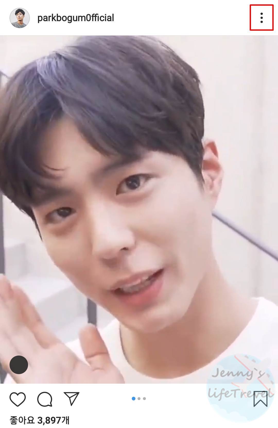 1. 인스타그램에서 공유하고 싶은 게시물의 오른쪽 상단 더보기 탭을 누릅니다.