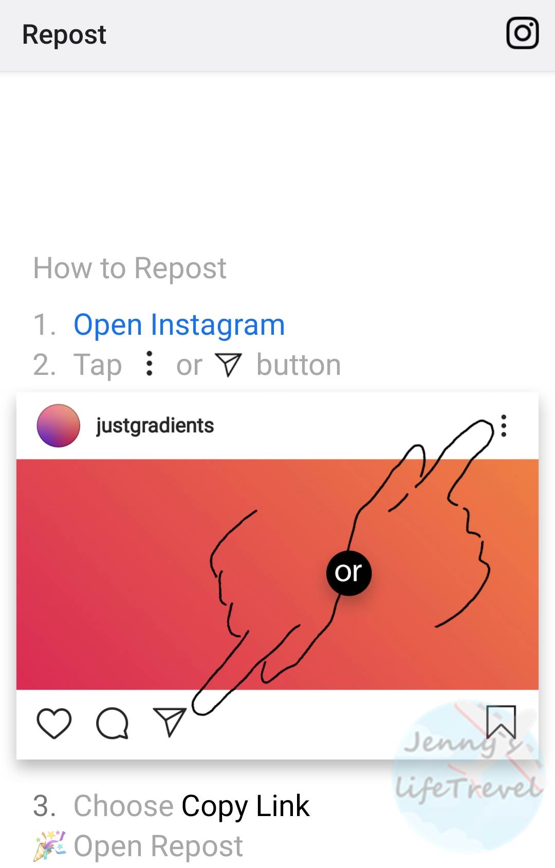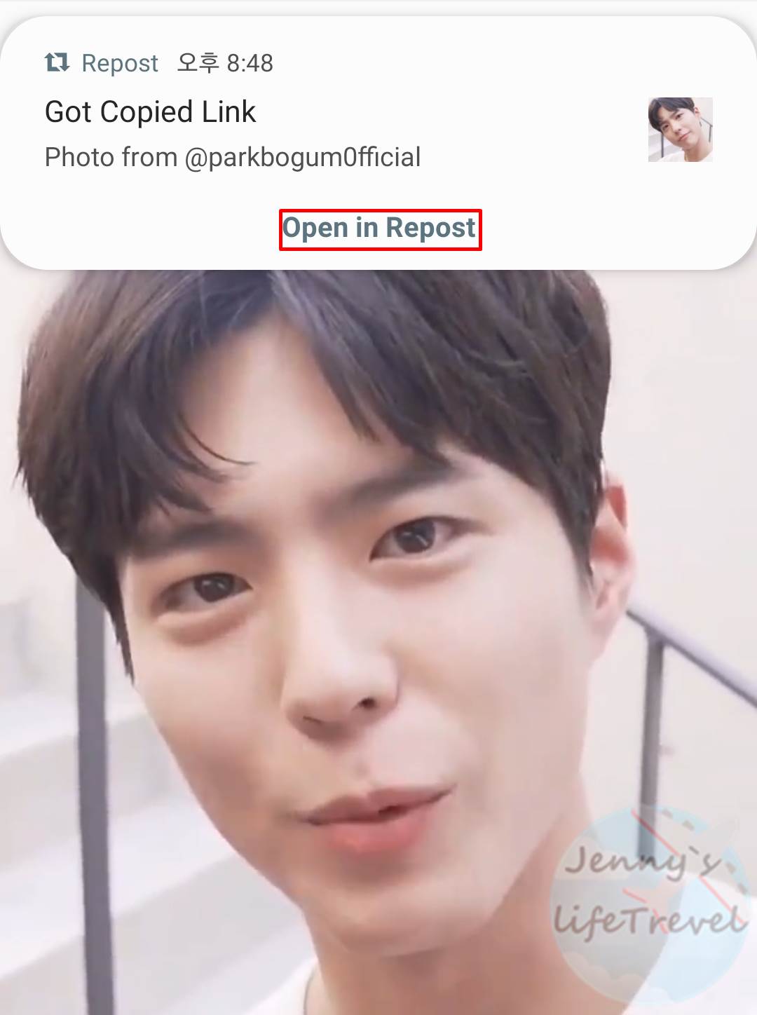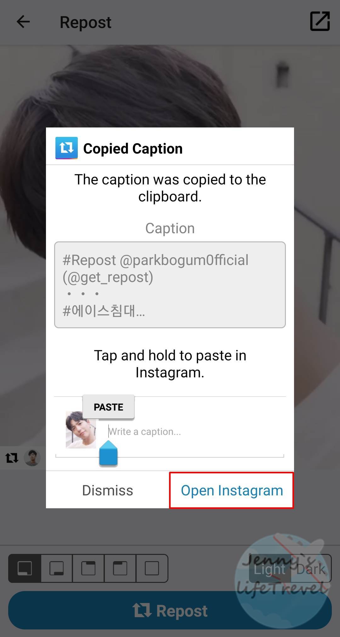 5. 공유하고자 하는 게시물에 있던 캡션과 리포스트를 알려주는 #태그가 클립보드에 복사되었다는 표시 입니다. 이제 Open Instagram을 탭 합니다.