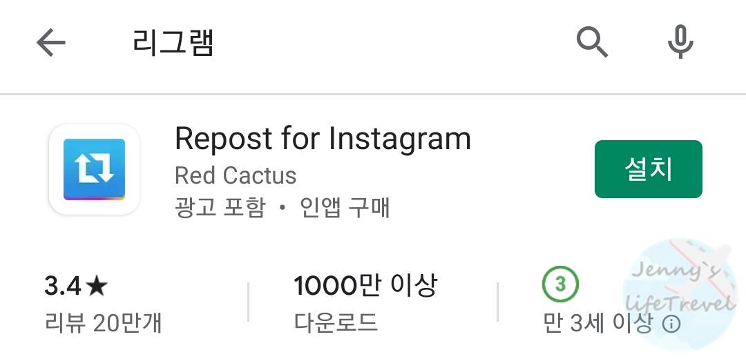 스토어에서 리그램을 검색한뒤 Repost for Instagram 어플리케이션을 설치 합니다. 인스타 리그램을 지원하는 앱 입니다.