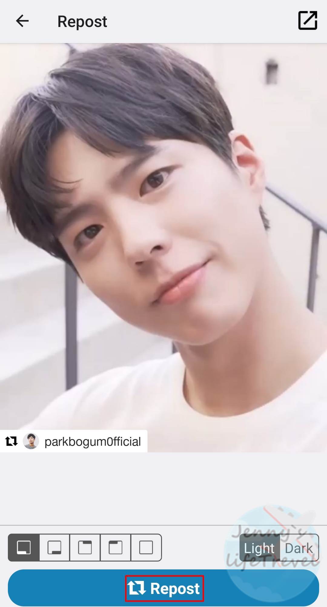4. 공유된 게시물을 표시하는 리그램 마크를 원하는 위치로 바꾸시고 Repost 탭을 누릅니다.